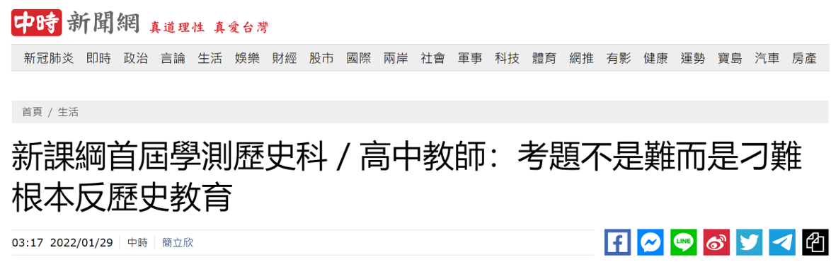 報道提到,台灣2019年啓用的“新課綱”高中歷史“以東亞史置換中國史”,曾被島內學者痛批“去中國化”,3年後的首屆“學測”歷史學科考清末歷史、“台灣戒嚴時期”等,有島內學者直言“感覺上只想負面呈現中國史和國民政府”。