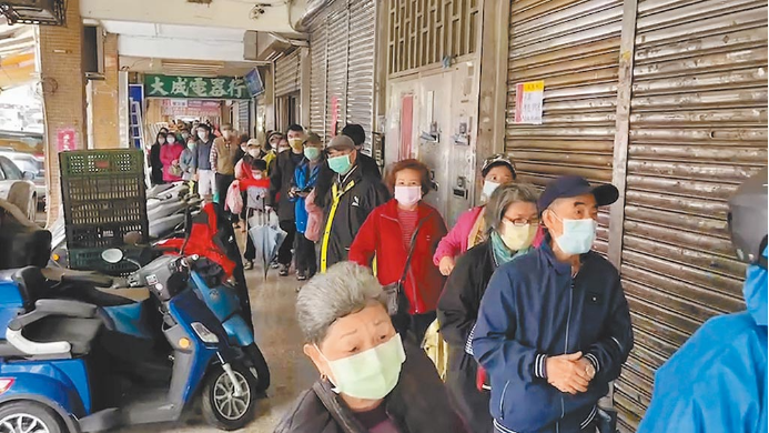 另一家商鋪則是事先公告當天上午11時30分營業,採取每人限制購買100元新台幣的雞蛋,現場湧入排隊人潮,至少超過百位民眾在騎樓排隊等候,人龍比打疫苗的隊伍還長。