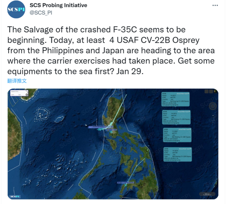 南海戰略態勢感知29日發推稱,墜毀的F-35C打撈工作似乎已經開始。今天,來自菲律賓和日本的至少 4 架美國空軍“魚鷹”傾轉旋翼運輸機正前往航母演習地區。該推文還提出疑問稱,這一行動是不是先將一些裝備運到海上?