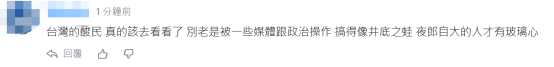 另有網友表示,“台灣的酸民,真的該去(大陸)看看了,別老是被一些媒體跟政治操作,搞得像井底之蛙,夜郎自大的人才有玻璃心”。↓