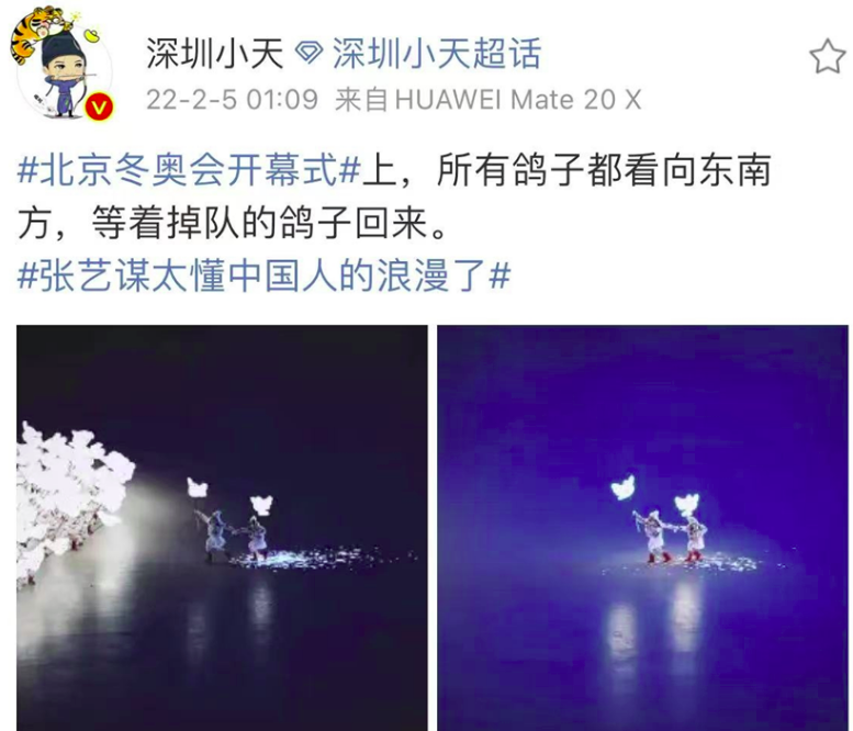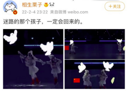 4日晚,在“鳥巢”國家體育場舉行的北京冬奧會開幕式上,一個由數百名小朋友手持和平鴿模型燈籠表演的節目《閃亮的雪花》讓許多網友在感動之餘,從中看到了一層“隱喻”。比如有網友説,“迷路的那個孩子,一定會回來的”。還有網友説,“所有的鴿子都看向東南方,等着掉隊的鴿子回來”。也有網友説,“早點回來,説的就是中國台灣”,“一鴿都不能少。” ↓