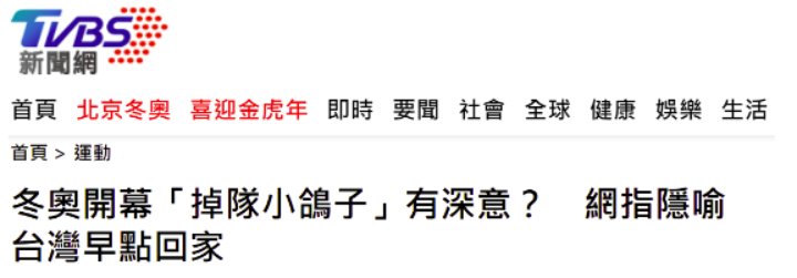 台灣TVBS新聞網:冬奧開幕“掉隊小鴿子”有深意?網指隱喻台灣早點回家↓