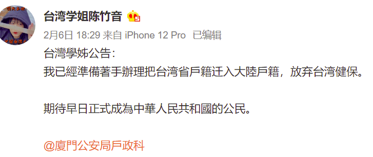台灣女孩陳竹音:已準備把台灣户籍遷入大陸,放棄台灣健保