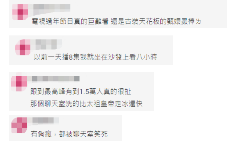 帖文曝光後,底下網友也紛紛留言回應,“電視過年節目真的巨難看,還是古裝天花板的甄嬛最棒了”、“以前一天播8集,我就坐在沙發上看8小時”、“最高峯有到1.5萬人真的很扯,那個聊天室洗得比太祖皇帝走冰還快”、“有夠瘋,都被聊天室笑死”、“甄嬛傳真的好看,滑到片段就會忍不住重刷”。
