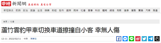 台陸軍“第六軍團指揮部”回應稱,所轄269旅一輛CM33(“雲豹”)八輪裝甲車於11日上午執行任務期間,行經桃園市蘆竹區南青路時與民用車輛發生擦撞(雙方均無酒駕,人員無礙),全案現由桃園市政府警察局進行事故責任認定。