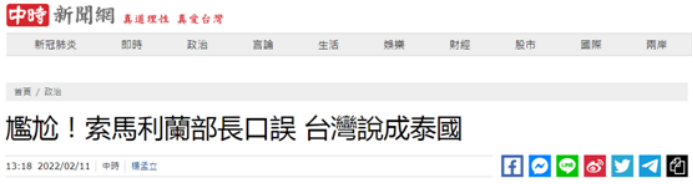 【環球網報道】近日,不被國際社會承認的索馬里蘭“外長”瑞格薩一行在台灣竄訪,台灣“中時新聞網”11日爆料稱,該政府“畜牧暨漁業發展部長”穆合德,在發言時兩度口誤將台灣説成“泰國”,一度讓現場氣氛陷入尷尬。
