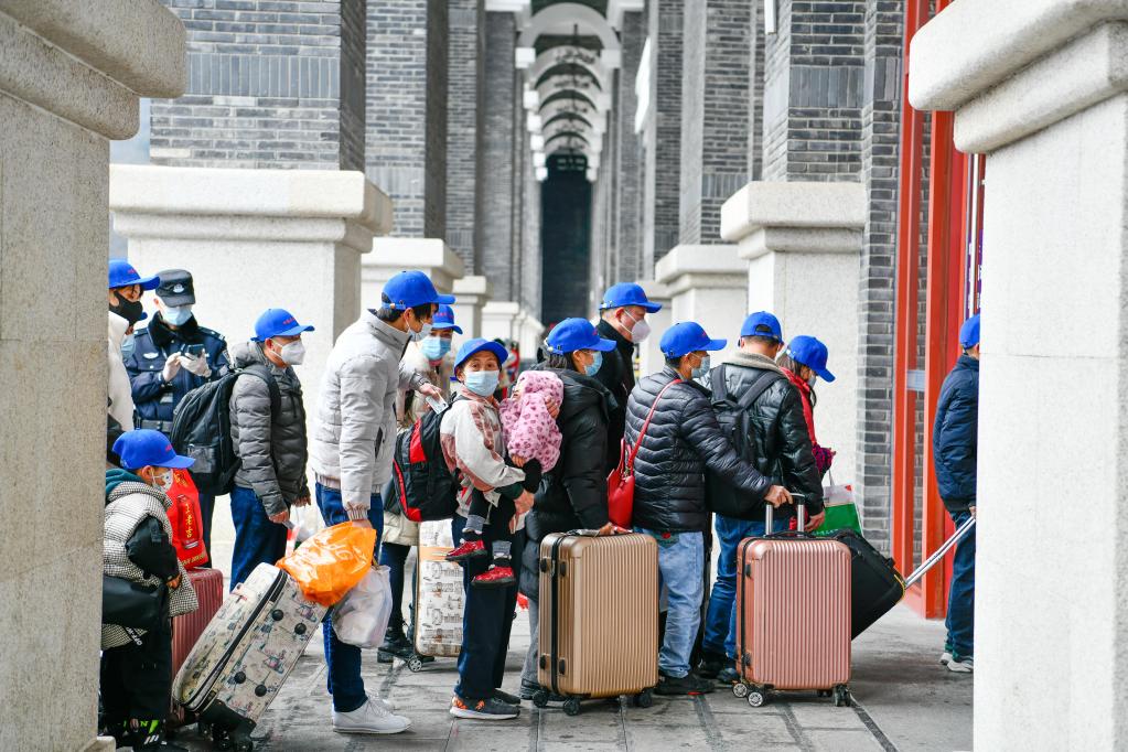 2022年2月8日,貴州今年首趟返崗務工免費動車專列發車,返崗務工人員在遵義站排隊等待安檢,前往廣東省廣州市、珠海市返崗務工。新華社記者 楊文斌 攝