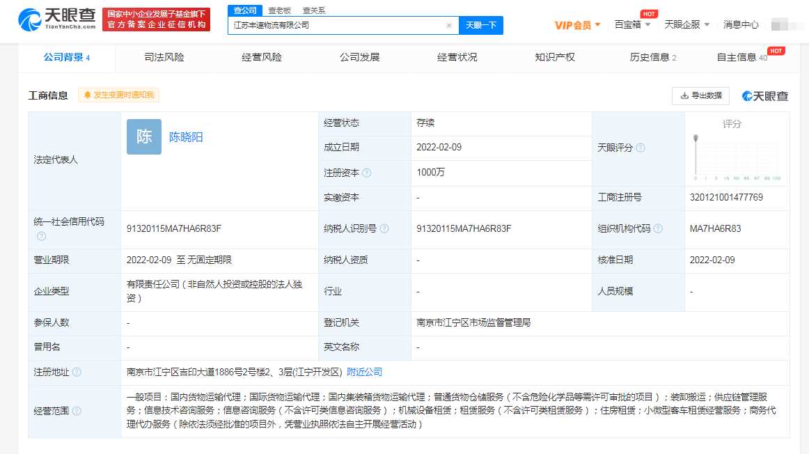 【環球網財經消費資訊 記者 樊俊卿】根據天眼查相關數據顯示,由順豐速遞注資千萬的新物流公司江蘇豐速物流有限公司於2月9日正式成立,新物流公司的註冊地址在南京,法定代表人為陳曉陽。