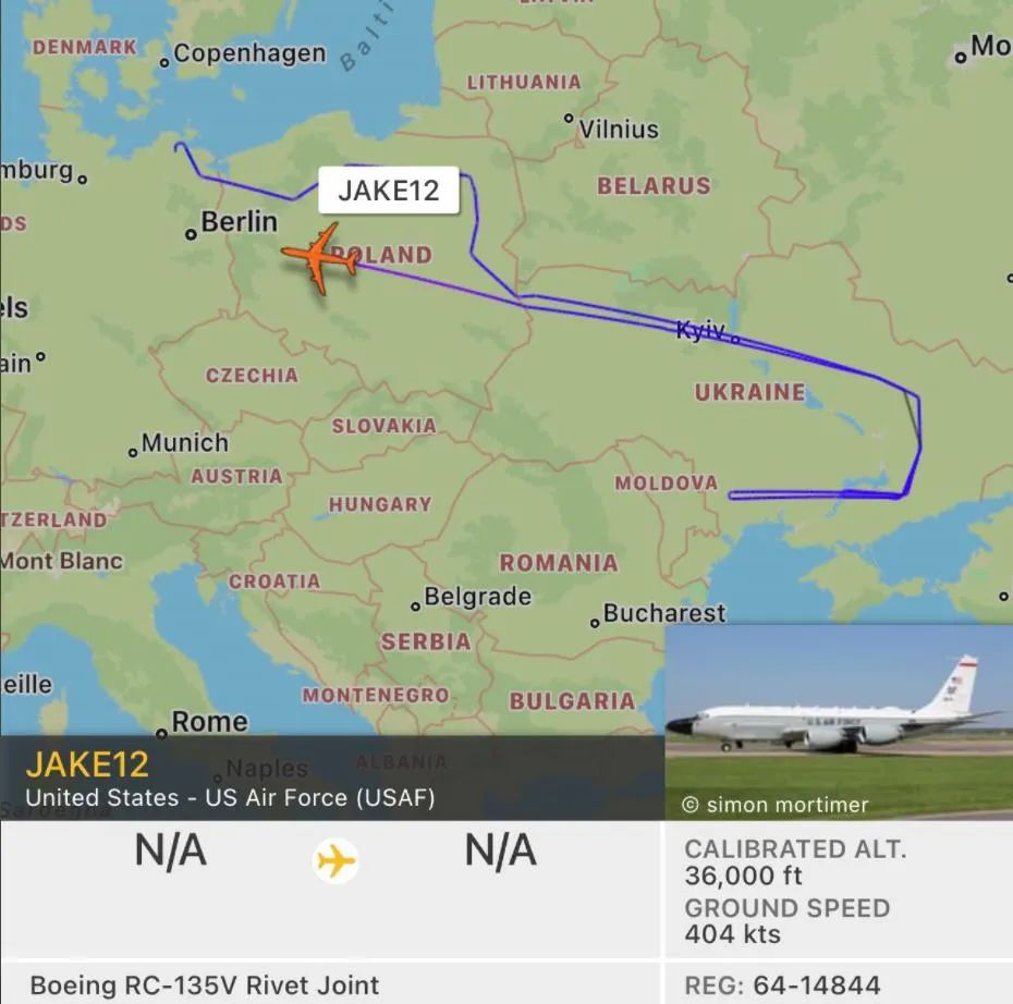 14日當天,美國空軍一架RC-135V偵察機在烏克蘭上空執行了一次短暫的偵察任務。