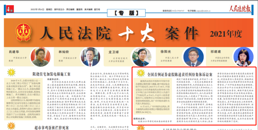 中國證券集體訴訟第一案入選“新時代推動法治進程2021年度十大案件”