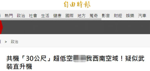 【環球網報道】島內綠媒《自由時報》16日宣稱,解放軍軍機頻繁“襲擾”台灣“空域”,台空軍幾乎每天都升空“應對”,剛過元宵節,解放軍軍機今天(16日)又進入台西南空域,其中一次超低空“30米”高度飛行,報道聲稱不排除是去年11月19日出現的武裝直升機。