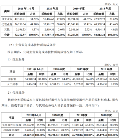 另據招股書披露,凌雲光的主營業務按照不同模式劃分為自主業務和代理業務,報告期內公司的代理業務收入分別為56562.69萬元、64211.15萬元、81798.55萬元和43866.10萬元,佔主營業務收入的比例分別為 40.26%、44.89%、46.60%和 38.60%,針對該項業務招股書披露其內容為“從事境外知名品牌的光纖器件與儀器、視覺器件的代理業務”。