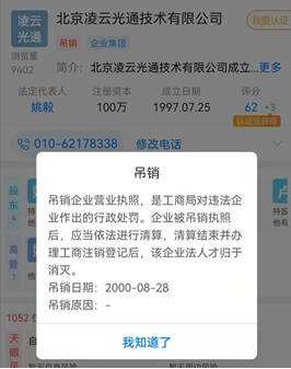 不僅如此,招股書披露凌雲光的總經理助理楊影女士,此前於2002年6月至2002年8月任北京凌雲光通技術有限公司銷售工程師,但如《天眼查》檢索顯示,“北京凌雲光通技術有限公司”已於2000年8月被吊銷,楊影女士卻能夠在兩年之後仍然擔任這家公司的銷售工程師,這並不符合常理。