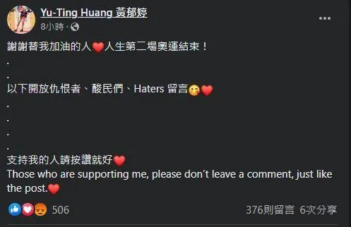 黃鬱婷17日在北京冬季奧運會競速滑冰女子1000米項目中,滑出1分17秒35的成績,排名第24。結束比賽後,17日深夜她在自己的臉書、微博上發文,是繼隊服事件後相隔15天再發文,黃鬱婷寫道:“謝謝替我加油的人,人生第二場奧運結束!以下開放仇恨者、酸民們、Haters 留言,支持我的人請按贊就好。”