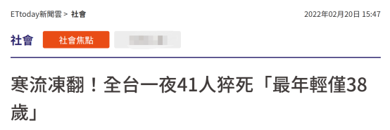 台媒:疑受寒流影響,台灣“一夜猝死41人”,300多人不適送醫