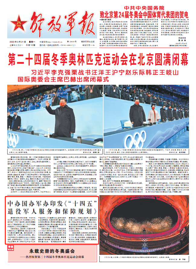 新華社北京2月20日電 中共中央辦公廳、國務院辦公廳、中央軍委辦公廳日前印發《“十四五”退役軍人服務和保障規劃》(以下簡稱《規劃》),對“十四五”時期做好退役軍人工作作出部署安排。
