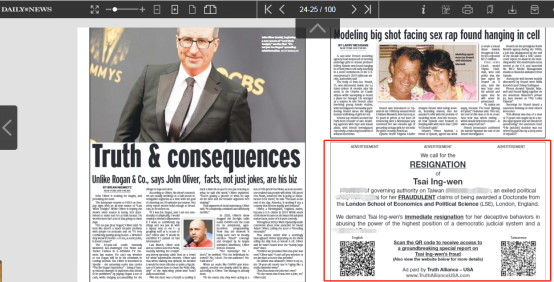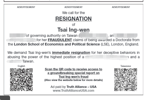 報道稱,關於呼籲蔡英文下台的廣告已在《紐約每日新聞》電子版當地時間2月20日報道的第25頁上登出, 廣告內容以“我們呼籲蔡英文下台”為題,內文提到,蔡英文是台灣地區當局領導人,“因為她謊稱獲得了英國倫敦政治經濟學院(LSE)的博士學位。我們呼籲蔡英文立即下台,因為她濫用職權的欺騙性行為等”。