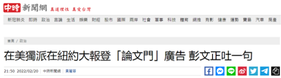據報道,此前因質疑蔡英文博士論文造假並被民進黨當局起訴而“流亡”美國的台灣媒體人彭文正20日,在其自媒體節目《政經關不了》中透露,“一個讓大家振奮的消息,也就是蔡英文論文門登上美國第五大報《紐約每日新聞》,標題為‘我們呼籲蔡英文下台’”,彭文正表示,此次是在美台胞集資2.5萬美元,在美國第五大報《紐約每日新聞》買下的廣告。