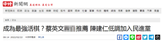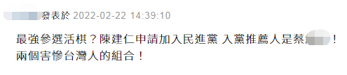另有網友質疑,“啥?我還以為他(指陳建仁)本來就是民進黨的,這也太會騙了吧,現在是不是都先在外面騙風雨,等搞出了成果之後,再入黨養老,沒搞好的就一句話‘他又不是民進黨的’,來切割就停損了……” ↓