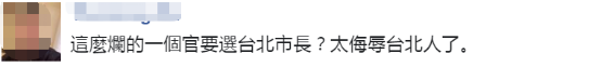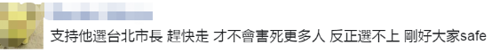還有網友諷刺道:“支持他選台北市長,趕快走,才不會害死更多人,反正選不上,剛好大家safe”。↓