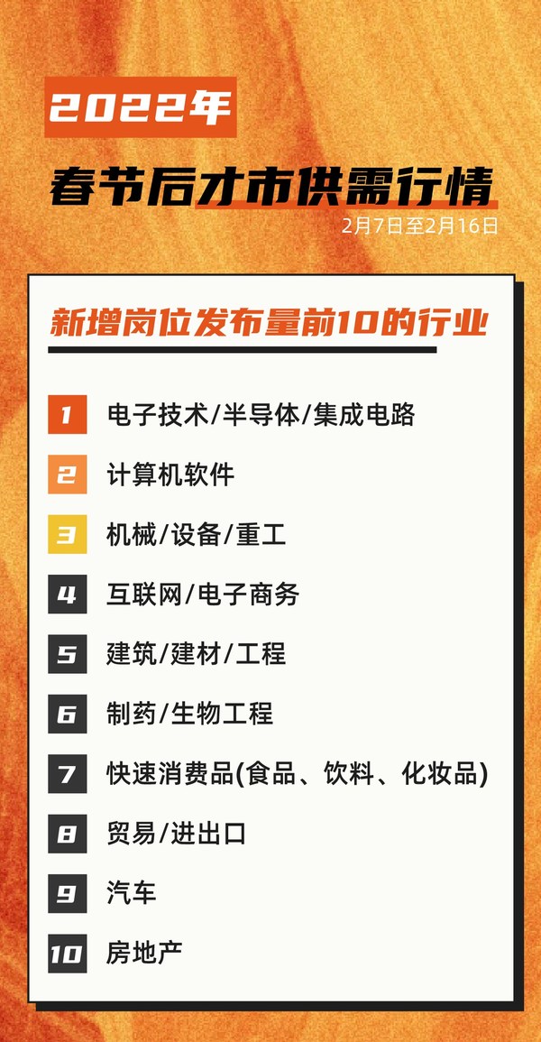 根據前程無憂的行業分類,在60個大行業中,電子技術/半導體/集成電路行業的節後(2月7日~2月16日期間)新增崗位發佈量(一個崗位可招聘多人)超過6.7萬個,計算機軟件行業新增超過6.4萬個,機械/設備/重工行業新增超過6.1萬個,互聯網/電子商務行業和建築/建材/工程行業均新增超過4.4萬個,依次分列前五。