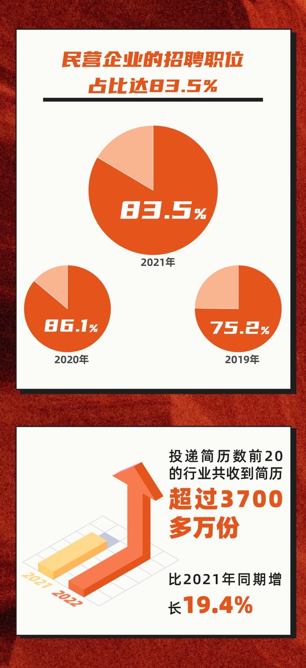 民營企業提供了超過83.5%的工作機會,2021年同期這一比例為86.1%,而疫情前的2019年同期這一比例為75.2%。與此同時,在春節後尋找新的工作機會的人羣也大幅增加,簡歷投遞量較去年同期增加19.4%。