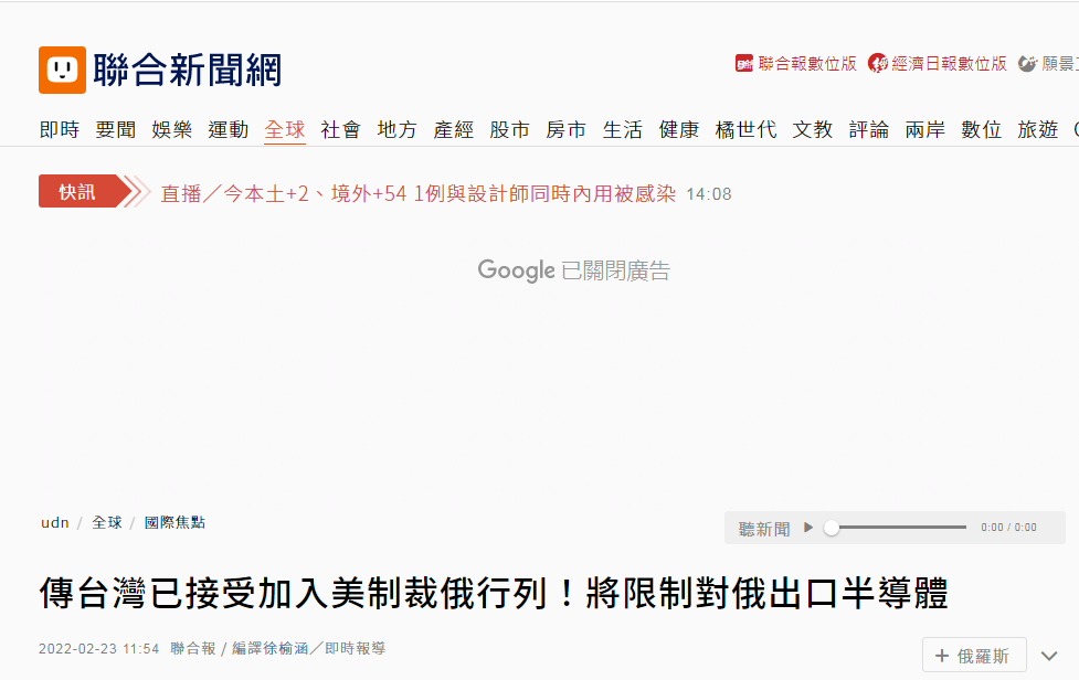 同日,島內《聯合報》也報道稱,“傳台灣已接受加入美製裁俄行列!將限制對俄出口半導體”。