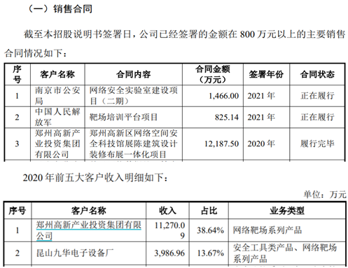 另據招股書第426頁披露的“已經簽署的金額在800萬元以上的主要銷售合同”相關信息,永信至誠在2020年與客户“鄭州高新產業投資集團有限公司”簽訂了關於“網絡安全科技館項目”,合同金額為12187.5萬元。