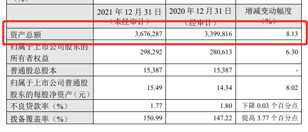 資產規模方面,業績快報顯示,2021年華夏銀行資產總額達36762.87億元,較上年末增長8.13%。不過,與2020年資產規模同比增長12.55%相比,去年資產規模增速有所回落。具體而言,貸款總額為22135.29億元,較上年末增長4.96%。