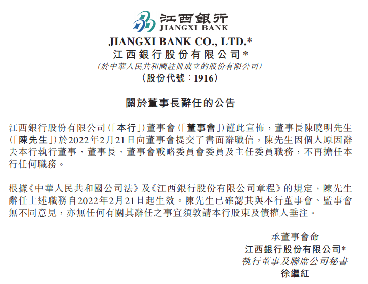 江西銀行公告稱,陳曉明辭任上述職務自2月21日起生效。