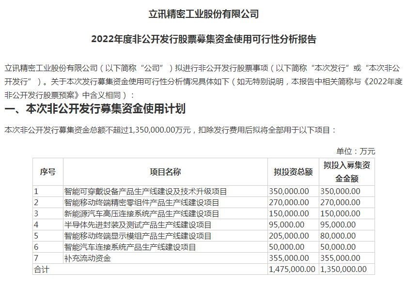 從募資投向來看,智能可穿戴設備生產線建設和技術升級項目募資35億元;智能移動終端精密零組件產品生產線建設募資27億元;新能源汽車高壓連接系統產品生產線建設募資15億元;半導體先進封裝及測試生產線建設項目募資9.5億元;智能移動終端模組生產線項目募資8億元;智能汽車連接系統產品生產線募資5億元;補充流動資金35.5億元。同時,公告顯示上述項目建設週期均為2年。