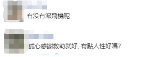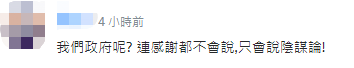 也有網友質疑台當局,“我們‘政府’呢?連感謝都不會説,只會説陰謀論!”