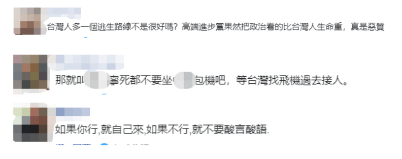 還有人毫不客氣地説,“台灣人多一個逃生路線不是很好嗎?高端進步黨(指民進黨)果然把政治看的比台灣人生命重,真是惡質。”“那就叫民眾寧死不要坐大陸包機,等台灣找飛機過去接人。”“如果你行,就自己來,如果不行,就不要酸言酸語。”
