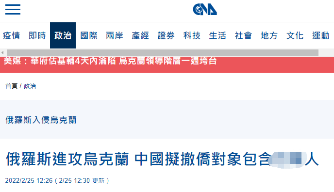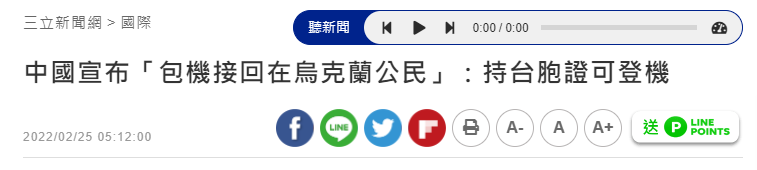 【環球網報道】烏克蘭局勢惡化,中國駐烏克蘭大使館25日零時許發佈自烏克蘭撤離中國公民進行登記的緊急通知,通知稱在烏公民和中資企業處於較高安全風險,為準備分批包機接返有關事宜,開始人員登記,通知提到持台胞證者也可登記。這一消息很快引起島內媒體和網友的關注,有網友稱,“祖國温暖點滴在心頭”。然而這件事卻被台當局外事部門抹黑為“操弄政治宣傳”。