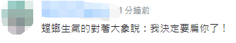 還有網友打了個比方,“螳螂生氣地對着大象説:我決定要扁你了!”有人諷刺,“這已經不是狗吠火車了,是螞蟻吠火車。” ↓