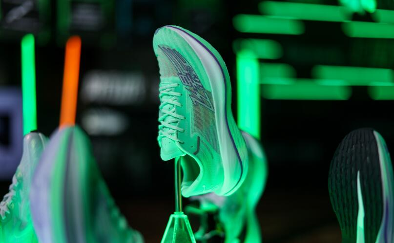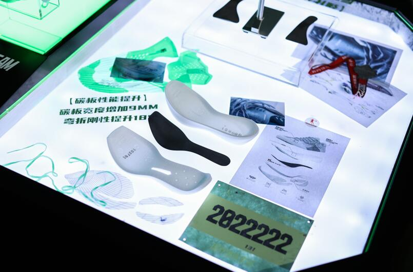 馬磊介紹:“飛影PB2.0搭載了最新的‘超臨界巭PRO中底’科技,我們在1.0的基礎上對鞋內的碳板做了調整,翹度進一步增加,回彈和硬度更好,實現動力升級。而就舒適性而言,我們吸取了很多消費者對1.0版本的反饋,將新品的幫面材質、領口設計以及鞋舌等部位進行了優化,整體包裹性更好,穿着更為舒服。而在穩定性方面,我們把新品碳板的寬度做了適當加寬,踩下去之後穩定性整體升級。”