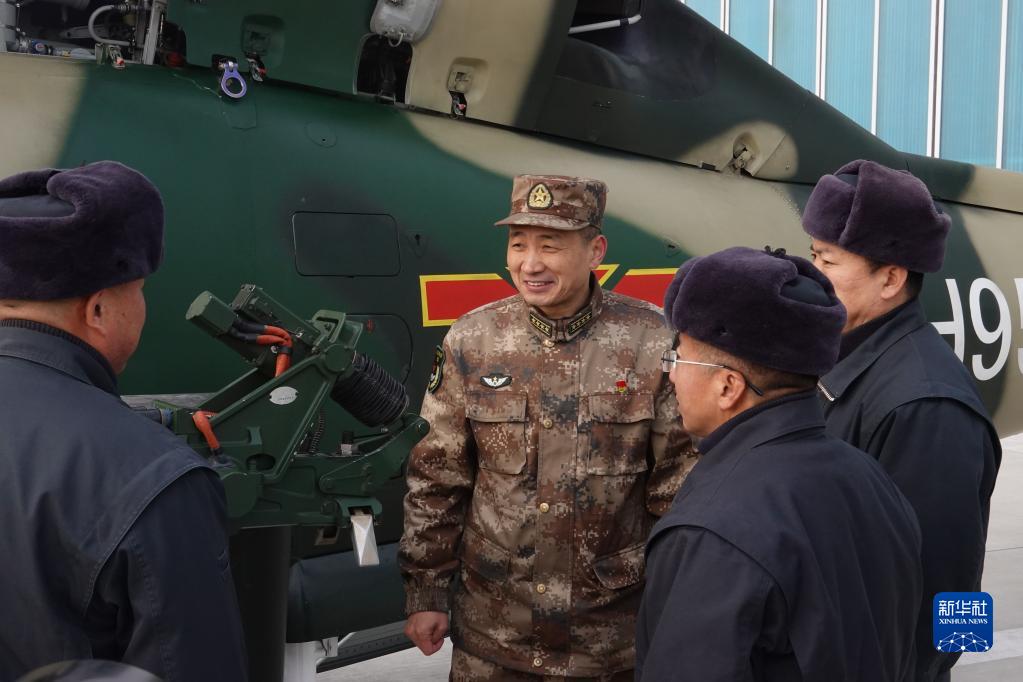 第82集團軍某陸航旅政委汪曉紅(中)到連隊調研(2月12日攝)。新華社記者 張永進 攝