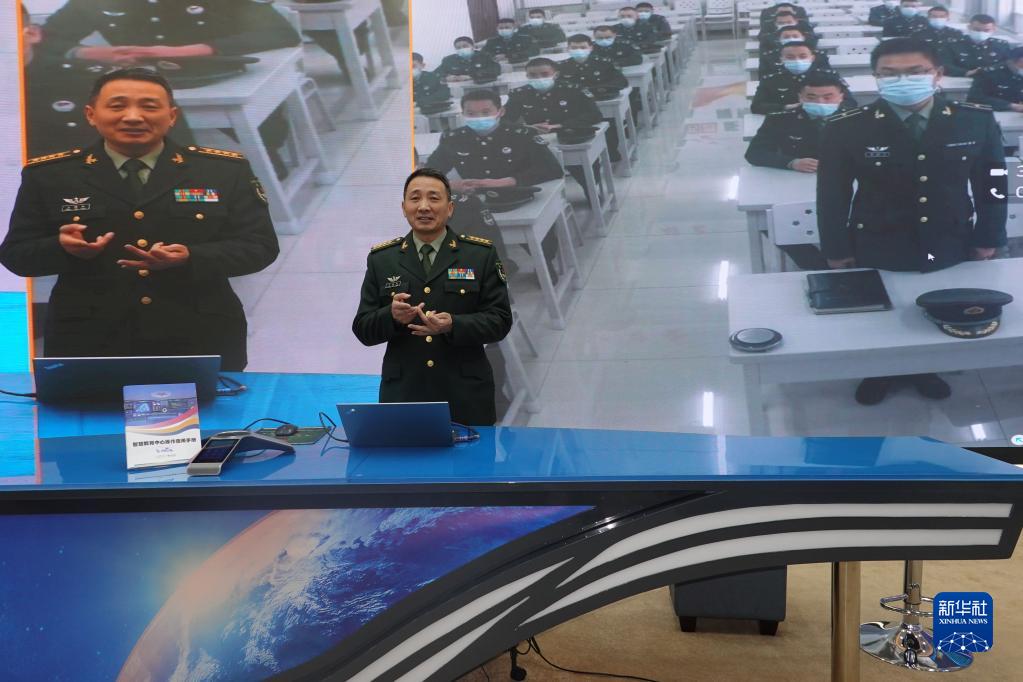 第82集團軍某陸航旅政委汪曉紅利用智慧教育平台為官兵上黨課(2月13日攝)。新華社記者 張永進 攝