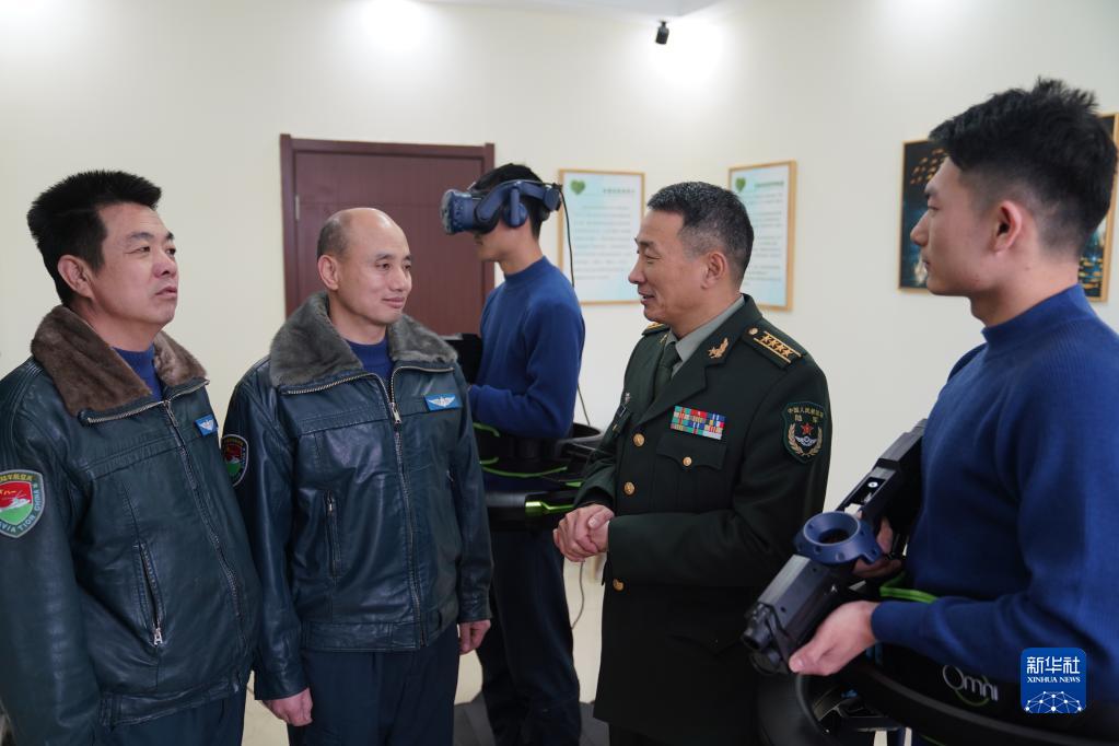 第82集團軍某陸航旅政委汪曉紅(右二)在旅心理服務中心,瞭解飛行員抗壓訓練效果(2月12日攝)。新華社記者 張永進 攝