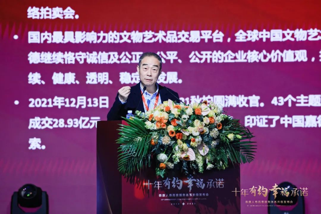寇勤用風趣幽默的語言和故事,介紹了嘉德拍賣、嘉德藝術中心、嘉德文庫、嘉德教育、嘉德藝術品保管庫及定製服務等特色服務。他表示:將用嘉德三十年專業資源,助力泰康高客服務全新升級,為泰康高客打造極致的藝術超級體驗。