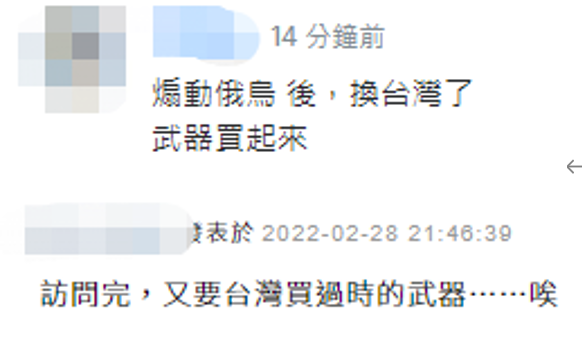 拜登將派前官員代表團竄訪台灣的消息傳出後,很快就在島內引起議論,有網友在台媒評論區留言表示,“煽動俄烏後,換台灣了,武器買起來。”“訪問完,又要台灣買過時的武器……唉”