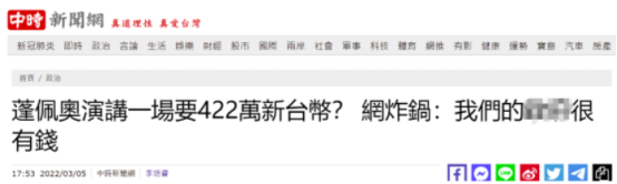【環球網綜合報道 記者 趙友平】竄訪台灣的美國前國務卿蓬佩奧被台媒爆出實為索“政治保護費”後,今日又有台媒爆料,其“訪台”酬金高達15萬美元(約422萬新台幣)。台外事部門對此聲稱,蓬佩奧來台是由“遠景基金會主辦”、並與演講公司進行簽約,“報酬部分不便代為説明”。不少島內網友都對此感到傻眼,有網友諷刺道:“我們‘政府’很有錢啊”,也有網友罵蓬佩奧擺明是來拿錢的,“髒透了”。