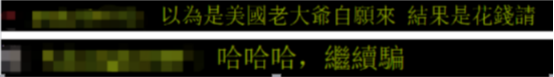 “中時新聞網”稱,此事在島內網絡論壇PTT上引發網友熱議。不少島內網友諷刺民進黨當局,“我們‘政府’很有錢啊”、“原來是花錢請來的,台灣人的錢真好騙”。↓