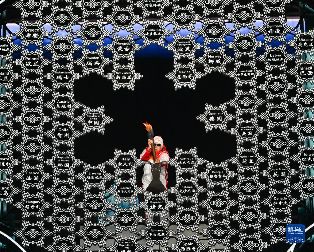3月4日晚,北京2022年冬殘奧會開幕式在北京國家體育場舉行。這是最後一棒火炬手李端將火炬嵌入“大雪花”中央。新華社記者 宋彥樺 攝