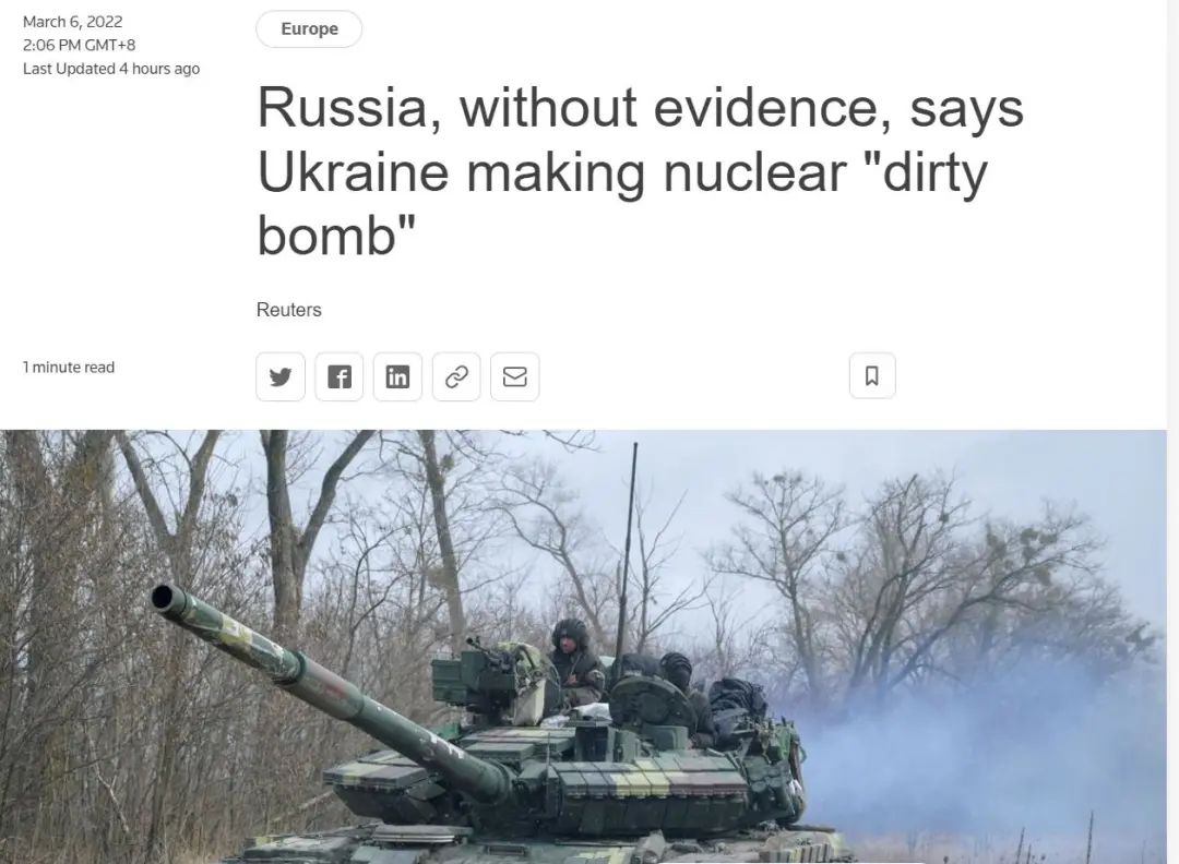 路透社6日的標題直接以“俄羅斯在沒有證據的情況下稱烏克蘭製造核髒彈”為題進行了報道,認為俄方對烏方製造“髒彈”的指責不值得相信。