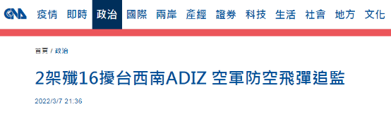 【環球網報道】據台灣“中央社”報道,台空軍今天(7日)聲稱,解放軍2架殲-16戰機今天進入台灣西南“防空識別區(ADIZ)”,台空軍派遣“空中巡邏兵力應對”、“廣播驅離”云云。