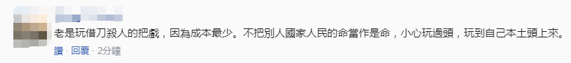 有網友批評美國,“老是玩借刀殺人的把戲,因為成本最少。不把別人國家人民的命當作是命,小心玩過頭,玩到自己本土頭上來。”↓