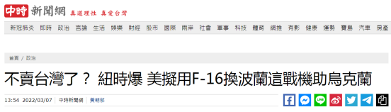 台灣“中時新聞網”則以,“不賣台灣了?紐時爆美擬用F-16換波蘭這戰機助烏克蘭”為題進行了報道,報道稱,“美國企圖以F-16戰機換取波蘭將其手上的俄羅斯制戰機提供給烏克蘭,而該批F-16戰機原本是要出口來台灣的!”
