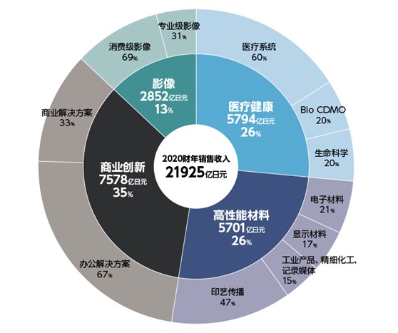 如今,富士膠片依然深耕影像市場,但相關業務在公司總銷售收入中只佔據不到15%(根據2020財年數據),醫療健康與高性能材料所佔營收比重越來越大。