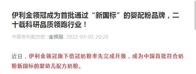 *【環球網財經消費資訊 記者 樊俊卿】*日前,伊利金領冠通過官方公眾平台宣稱,其品牌旗下倍冠奶粉通過中國嬰幼兒配方食品新國標,成為首批通過新國標的嬰幼兒配方奶粉品牌。